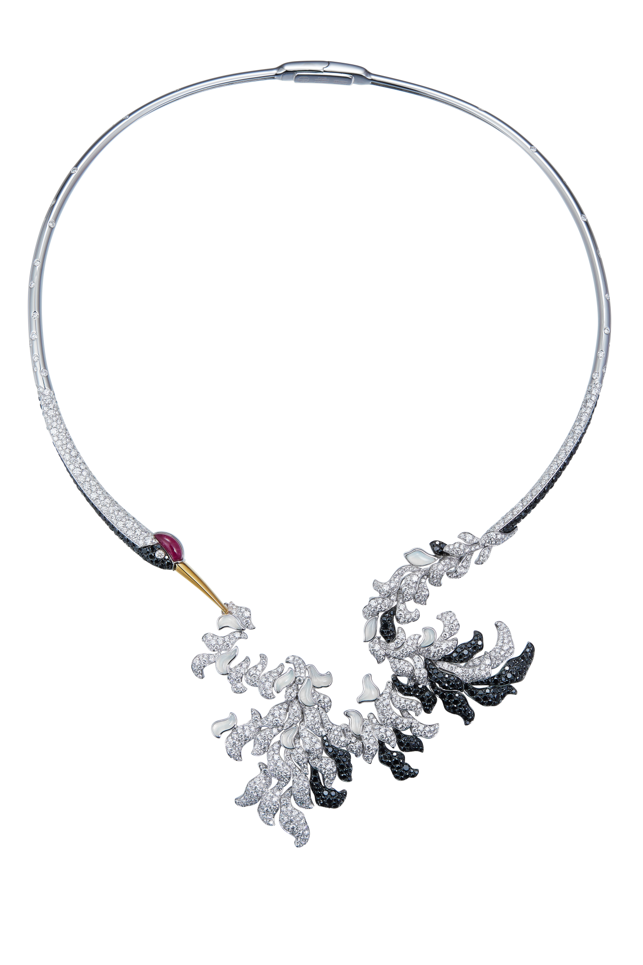 “鹤颈回环”将东方艺术的写意手法融入西式珠宝技艺,以简单线条一气呵成;“首尾相衔”仿佛仙鹤回首梳理羽毛,突出鹤尾翼和翅膀的复杂线条,与极简鹤颈形成对比,简繁相得益彰;“乌白鹤羽”使用最富想象的中式写意色彩晕染,洁白如雪、乌黑如炭;“殷红丹顶”在整个水墨基调中做点睛之笔,赋予舞鹤灵动生机。整幅画卷慢慢展开,俨然一幅栩栩如生的鹤舞图,东方风雅,呼之欲出。