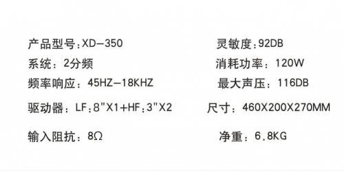 参数方面,功耗为120W,最大声压为116DB,频率响应为42HZ-18LHZ,重量为6.8KG,输入阻抗为8Ω,相对于同类产品在参数方面表现也是较为优异的,而在尺寸方面的设计更多考虑了家用的便携性,在占用空间小的同时,参数却一点也不输同类产品。