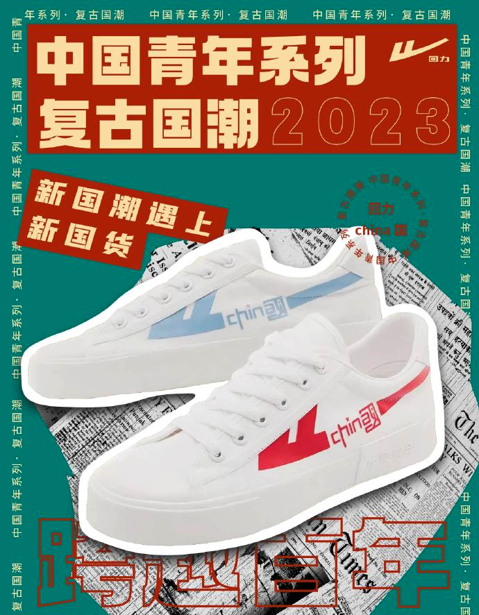 除了品牌的主动营销,回力设计也吸引了一大批时尚达人的自发分享,包括杨幂、刘雯等明星,日常穿搭中都经常出现回力的身影。而得到潮流年轻人的广泛青睐,离不开回力的国潮风设计。回力将中国传统文化当中充满浓郁国风的国潮元素,融入现代的简约设计,展示了老牌国货的原创设计能力。比如最近的“中国青年系列”,回力就将“中国”的文字元素融入品牌标识的设计中,新国潮遇上新国货,演绎了一场跨越百年的文化传承。