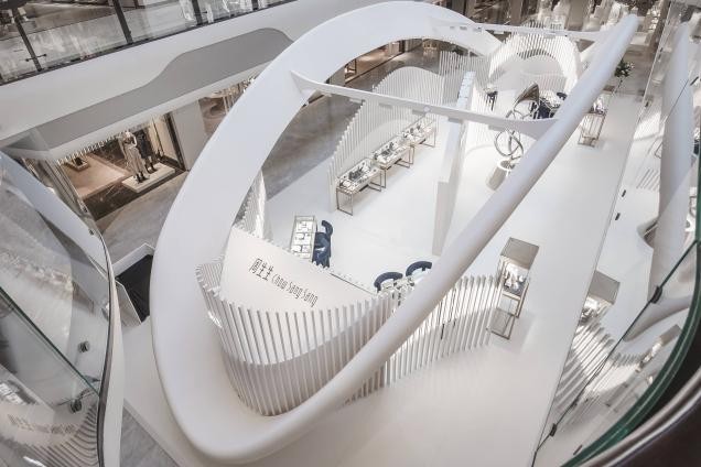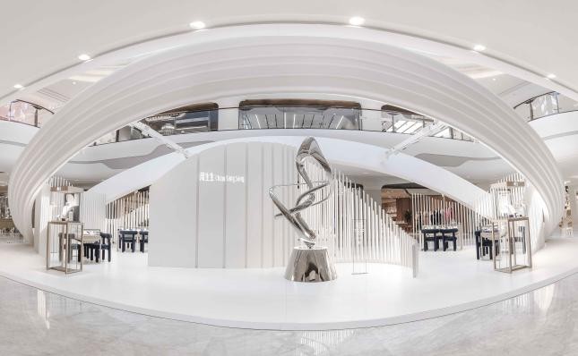本次珠宝展厅的整体空间围绕流动、律动的格调,营造出优美自然的氛围。高低起伏的密集格栅状结构,让空间的整体萦绕着自然、通透性的光影。中岛区域还特地设置了拍照打卡点,在钻之颂的旋律下,舞动的姿态形成了力与美的线条与旋律互相呼应。闪动的光辉,展示着女性每一个高光自信的时刻,呈现其强劲的生命力与活力,与“生生不息”的品牌理念相得益彰,歌颂“光芒交织·她乐章”的主题真谛。