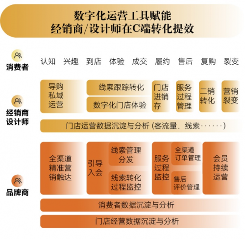 它需要从品牌方到经销商再到数字化系统服务者,在完成单一点位数字化升级的前提下,基于品牌特性系统性地构建起一套全新的天地人网和服务模型,从而提供更高效率、更高品质的家居消费体验。