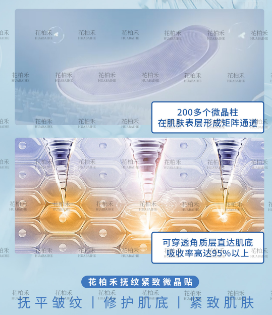 花柏禾微晶贴的核心,纳米微晶透皮导入技术,是我国科研学家高云华教授带领专业科研团队,历经20年不断研发、升级而成的心血,利用独有是配方技术,将数百个明星祛皱精华浓缩固化成微米级可溶性晶体形态,精细排列在微晶贴内,敷贴在想要改善的肌肤处,精华成分就会被自动吸收,精准输送、直达肌底,从皱纹根源处修护,吸收完成两小时内自动闭合输送通道,全程无创、无痛、无风险。