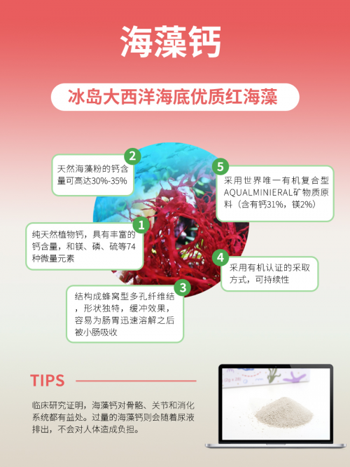 综上而言,补钙应趁早,需持续性,更要未雨绸缪。那如何补钙呢?首先是追溯源头,就是在钙源的选择上下功夫。钙源常见的分类有碳酸钙、柠檬酸钙以及乳酸钙等。而琴音と诗织系列海藻钙产品中所选用是一种天然植物钙——海藻钙,提取植物选自无工业污染的冰岛大西洋海底优质红海藻,其含有丰富的钙含量,以及镁、磷、硫等74种微量元素,加强了钙的活性,使其能被充分吸收和利用,天然海藻粉的钙含量可高达30%-35%。重要的一点,那就是过量的海藻钙会随着尿液排出,不会对人体造成负担。