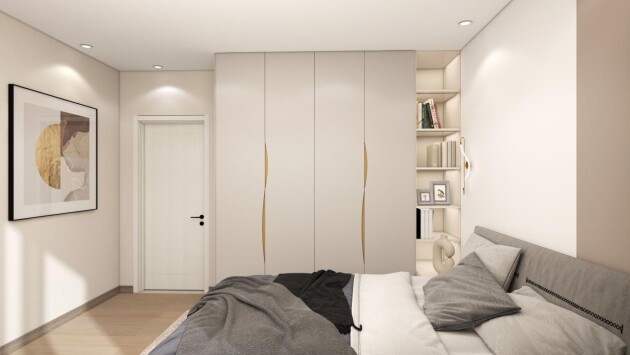 卧室的灯光设计,以氛围感十足的无主灯设计为主。打造奶油风灯光设计的层次感,一般采用基础照明,重点照明和装饰照明三种层次。本案例设计师采用筒灯以及暗藏灯带,达到基础照明照亮空间的需求,然后采用射灯或者轨道灯,来对某个特殊的区域进行重点照明。采用落地灯,或者壁灯,筒灯,射灯,灯带等等,进行照明上的补充和装饰的作用。