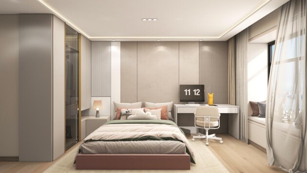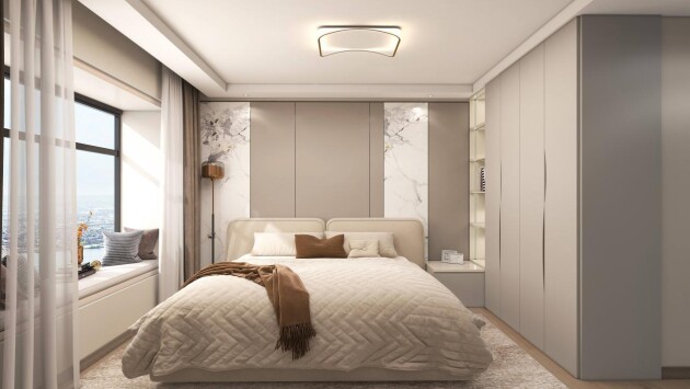 卧室的设计倍显舒适,靠窗一侧的飘窗尤为特别,随时为卧室带来暖阳的照拂,收纳衣柜体安放在卧室一侧,既不占空间也有实用性。驼色的地毯也由内而外散发着温润的质感。