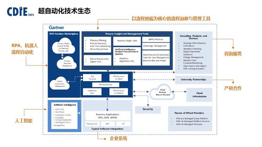 吴鑫首先为我们介绍了超自动化的概念及应用趋势:超自动化的概念是由Gartner在2019年提出,指RPA、低代码开发、流程挖掘、任务挖掘、OCR、NLP、等多种技术能力与软件工具的组合。