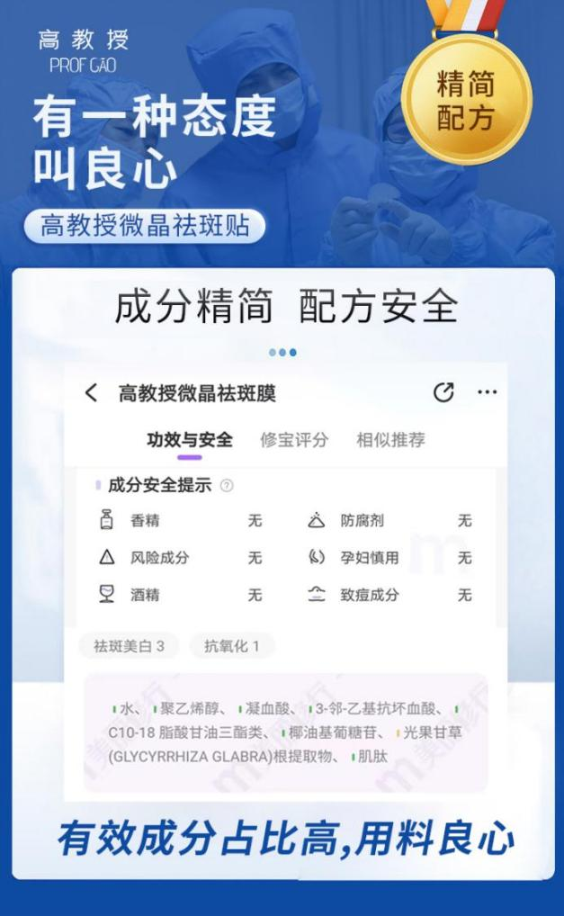 现在市面上的祛斑产品鱼龙混杂,竞争十分激烈。有些商家为了提高自己产品的功效,便会在产品内大量添加激素、铅汞等有害成分,长期使用这种产品很容易会导致我们皮肤溃烂,得不偿失。而高教授微晶祛斑从研发到量产一直都坚持安全祛斑的原则,还拥有国妆特字认证,通过了国家相关部门严格审核,证实产品不含任何激素、铅汞成分;并且高教授微晶祛斑还通过了权威第三方机构检测,证实了产品从成分和功效上都是非常优秀的,大家可以安心用,放心用,安全可靠,是大家选择高教授的重要前提。