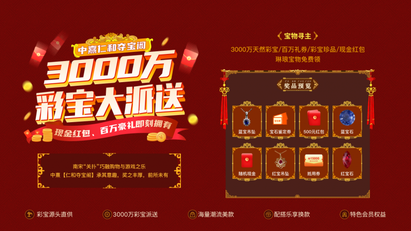 另有,【仁和夺宝阁】活动,更是中熹珠宝专为新老会员打造的一项100%中奖的超值福利活动,旨在全方位提升会员的权益价值,实现最大幅度的让利回馈。会员只需拥有仁和积分就可参与,0费用活动门槛,奖品更是涵盖3000万红蓝宝裸石派送(最大2ct)、现金红包、购物抵用券等,会员每参与一次都会获得对应的奖品。活动具备丰富的趣味性与互动性,通过好友间相互积攒仁和、分享喜悦、参与体验等方式,彻底激活会员朋友圈,形成互动双赢的良性循环。