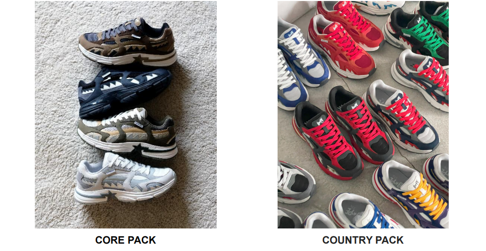 为庆祝BAPE® SHARK ZIP UP HOODIE(鲨鱼拉链帽衫)问世20周年,BAPE®以崭新概念打造年度重磅力作——全新鞋型SHARK STA。 全新鞋作涵盖COUNTRY PACK和CORE PACK两大系列,首发登场的COUNTRY PACK以象征国家荣耀的颜色和元素(如国家队、国旗等