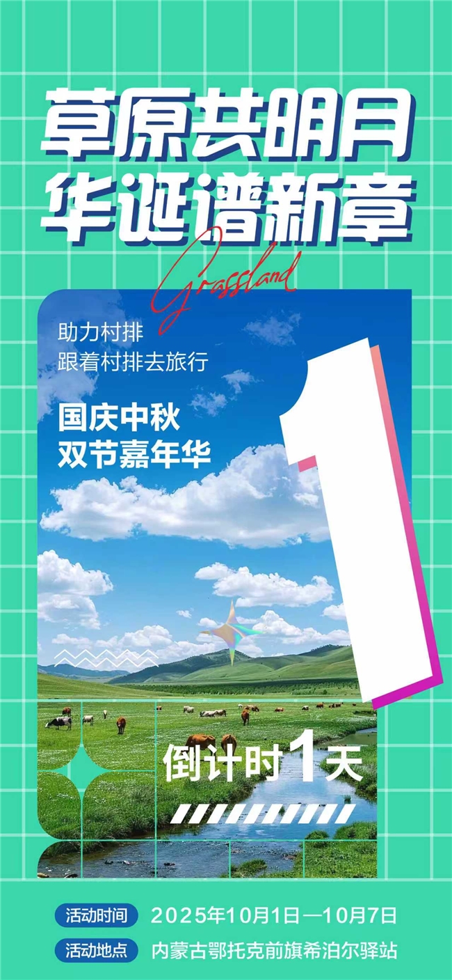 一场融合国风、民俗、红色记忆与草原风情的文化盛宴即将在希泊尔草原盛大开启。倒计时1天,草原、明月与浓郁的民族风情都已准备就绪,诚邀全国游客共赴这场别样的双节之约,在秋月清风中感受家国情怀,在非遗技艺中触摸文化脉搏,在互动体验中收获金秋最美回忆。