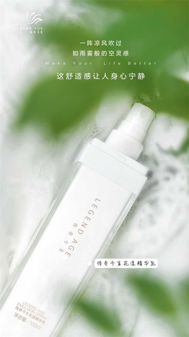 传奇今生花漾精华乳与一般的补水喷雾或精华乳液不同,它集滋润养护、补水锁水、水油均衡三大功能于一体,创造出“能喷能抹”的全新护肤体验,远喷雾,近喷乳,让我们的日常护肤更便捷。