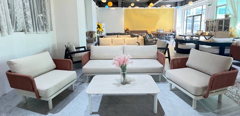 在舒适度与美学设计上,Mona系列同样亮点纷呈。产品扶手采用细腻编织绳工艺,自然纹理交织间尽显质朴韵味,为户外空间注入松弛氛围;座垫与靠包则选用高品质涤纶面料搭配速干棉内芯,软弹支撑感恰到好处,既实现"久坐不塌"的耐用性,又兼具"易清洁"的实用特性,面对饮料泼洒、灰尘附着等日常污渍,只需轻轻擦拭即可恢复洁净,极大地降低了户外家具的维护成本。另外,Mona系列即使长期放在户外日晒雨淋,也不用收纳,产品主打的就是一个舒适度与随意度。