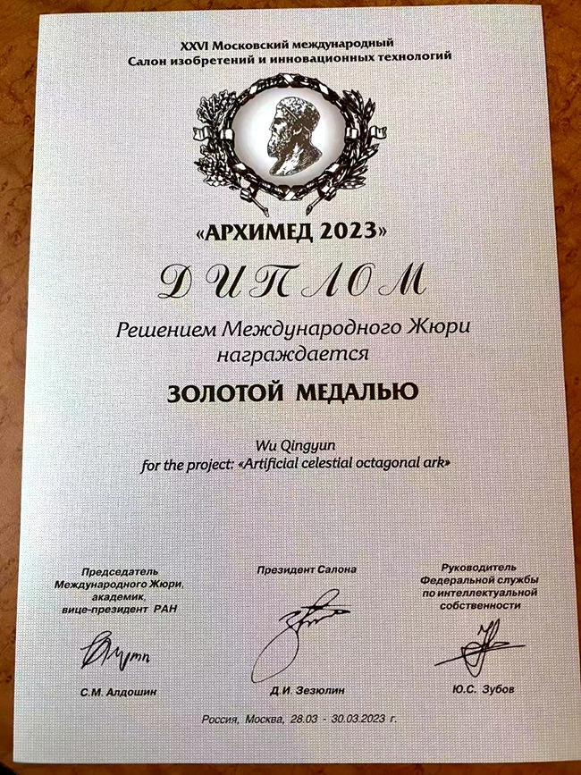 中国科技产业协会吴青云理事,《人造天体八角方舟》研制和应用荣获俄罗斯阿基米德发明奖金奖!