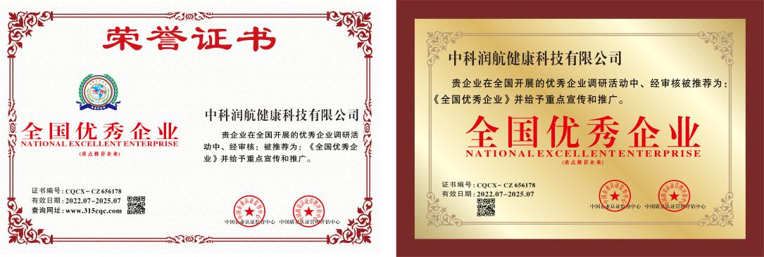 2022年,由中国企业认证监督中心和中国质量认证管理评估中心共同举办的全国优秀企业评选推介活动中,中科润航健康科技有限公司(简称中科润航)荣誉上榜,被共同推举为:全国优秀企业!