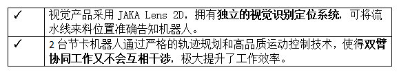例如,节卡机器人推出的新能源电芯贴胶应用,结合了节卡机器人的视觉产品和双臂轨迹规划,完成流水线上锂电池贴胶装配的工作。